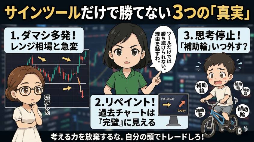 サインツールに頼り続けると、「なぜこのタイミングでサインが出たのか」を考えなくなるの。矢印が出た→エントリーする。矢印が出ない→何もしない。自分の頭を一切使わないトレードの完成よ。