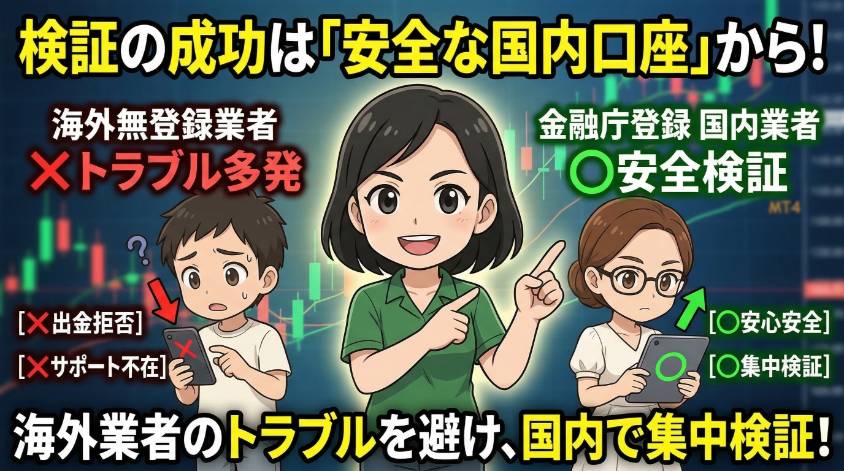 ここまでの3ステップを、いきなりリアルマネーで試さないで。まずはデモ口座で最低1ヶ月間検証するの。