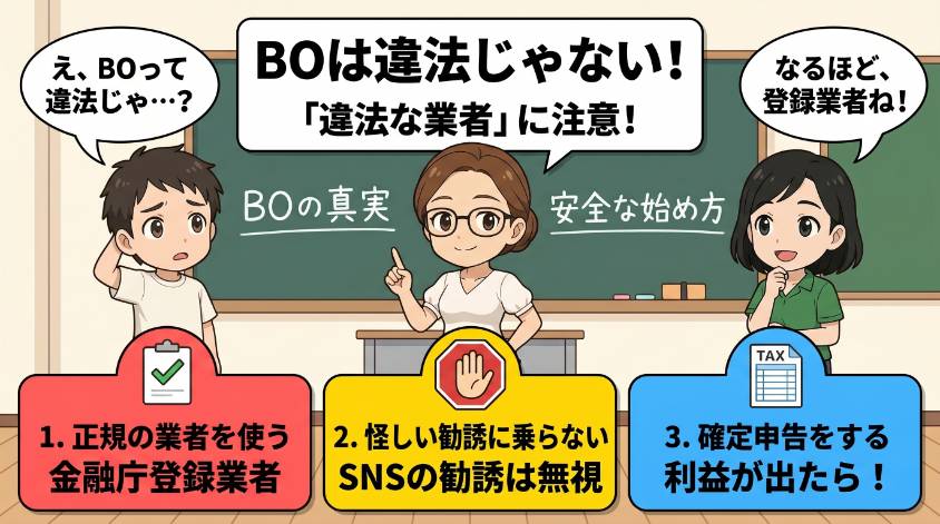 正しい知識があれば怖くないのよ。大事なのは「正規の業者を使う」「怪しい勧誘には絶対に乗らない」「利益が出たらちゃんと確定申告する」この3つだけ。