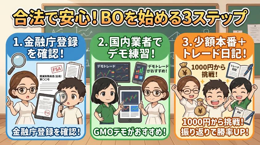 ここまで読んで、「バイナリーオプション自体は合法なんだ。じゃあ始めてみたい」と思った人もいるわよね。合法的に、安全に始めるための3ステップを紹介するわ。