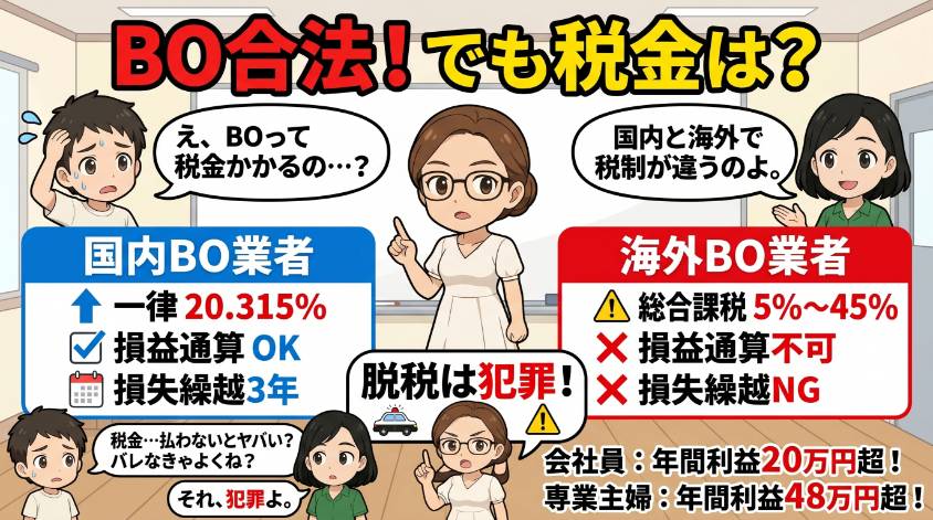 そっちは本当に「違法」になるわよ。脱税は犯罪だから。バイナリーオプション自体は合法でも、利益を申告しなかったら法律違反よ。利益が出たらちゃんと確定申告してね