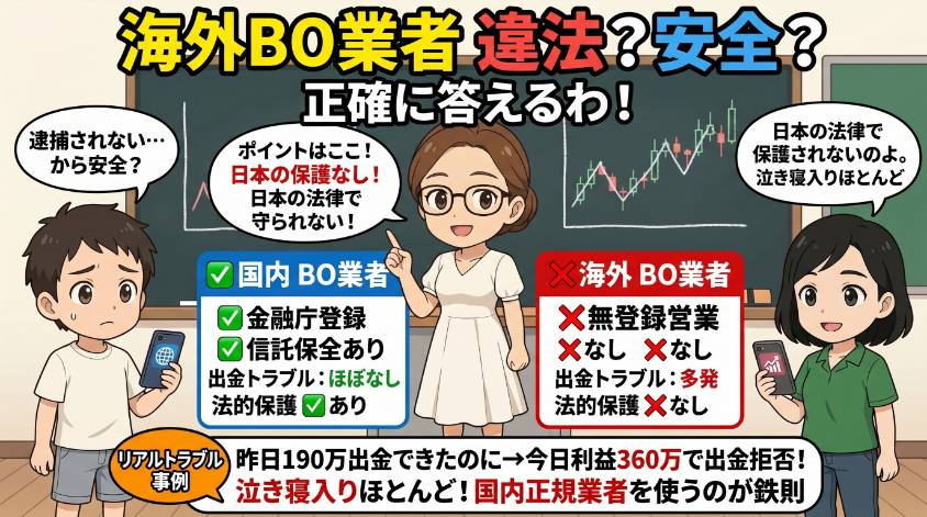でもここで冷静に考えてほしいの。違法なのは「その業者が無登録で営業していること」であって、「バイナリーオプションという金融商品そのもの」ではないの。ここ、すごく大事よ。