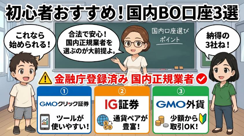具体的に言うと、GMOクリック証券、IG証券、外為どっとコム、ヒロセ通商……こういった金融庁登録済みの国内業者でバイナリーオプションをやる分には、何の法的問題もないわ。