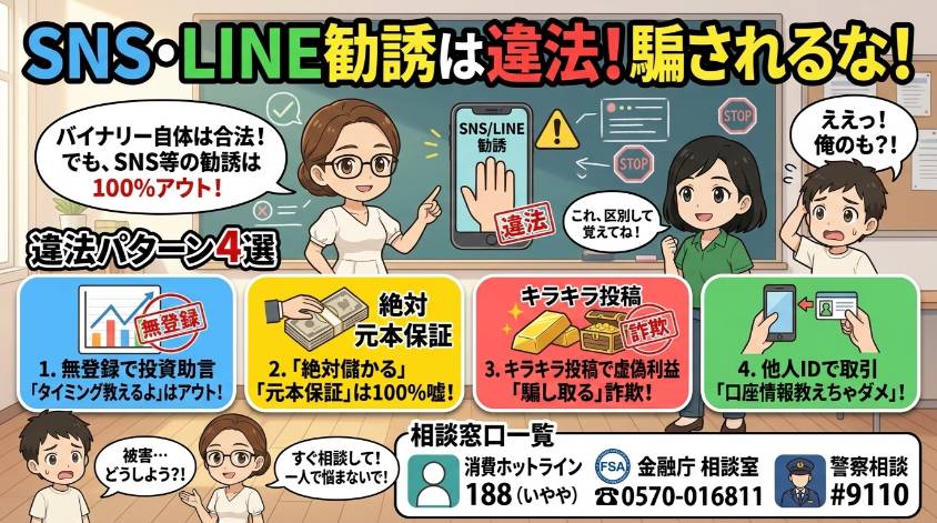 バイナリーオプション自体は合法。でも、SNSやLINEでバイナリーオプションを勧誘する行為は、違法になるケースが非常に多いの。ここ、しっかり区別して覚えてね。