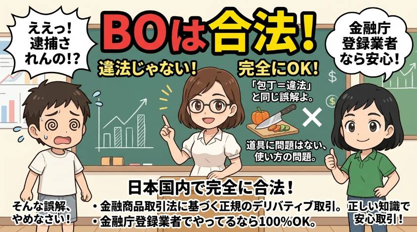 「バイナリーオプション=違法」っていうのは、「包丁=違法」って言ってるのと同じよ。包丁自体は料理に使う正当な道具。でも、包丁を使って人を傷つけたら犯罪でしょ?バイナリーオプションも同じ。金融商品自体に問題があるんじゃなくて、それを「誰が」「どうやって」提供してるかが問題なの。