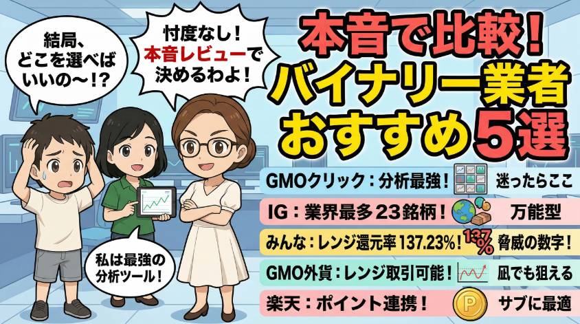 2026年時点で、金融庁に登録されたバイナリーオプション対応業者は7社よ。この記事ではその中から特に取引環境が整っている主要5社をピックアップして比較しているわ
