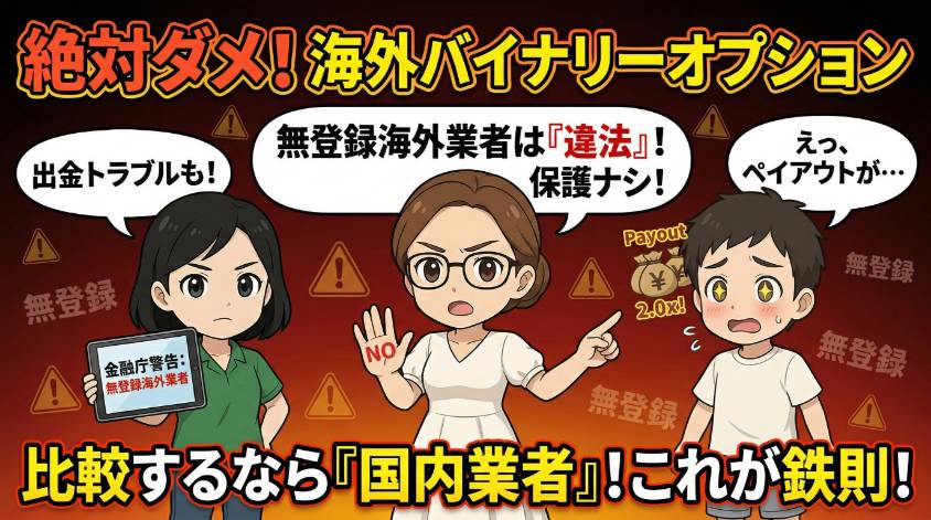 日本の金融庁に登録していない海外業者は、日本で営業すること自体が違法よ。金融庁も公式サイトで警告を出しているわ(金融庁:無登録の海外所在業者による勧誘にご注意ください)。