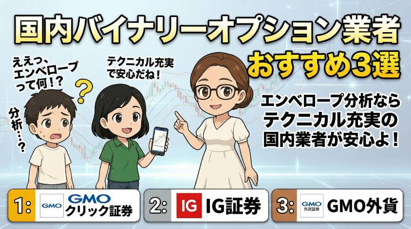 エンベロープを使ったチャート分析を実践するなら、テクニカル指標が充実した国内業者で始めるのが安心よ。