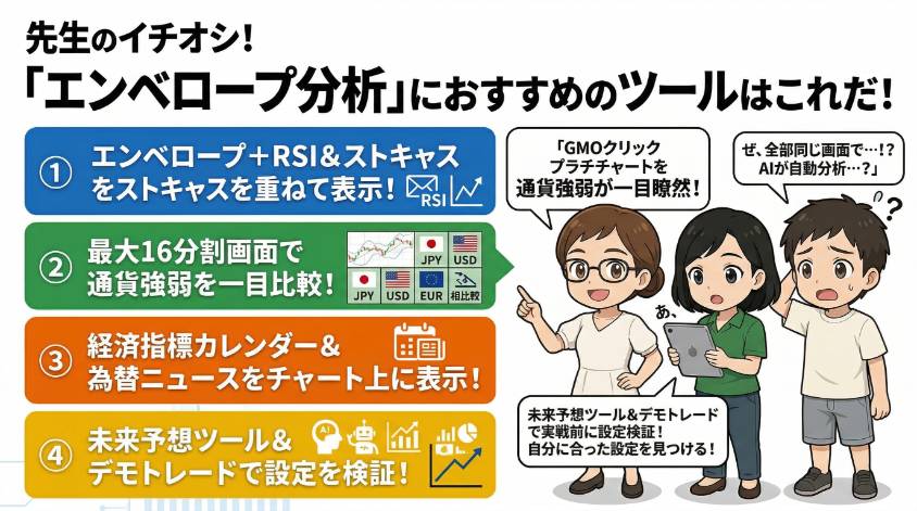 どのツールもデモトレードで試せるから、まずはデモでエンベロープの設定値をいろいろ変えて検証してみて。実弾を使う前に「自分に合った設定」を見つけるのが最短ルートよ。