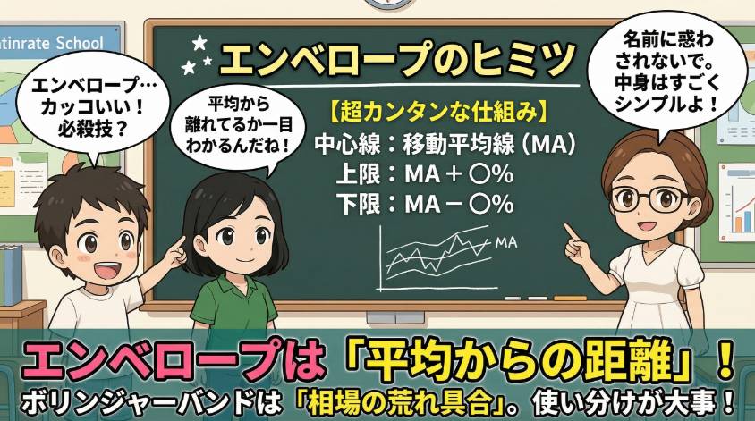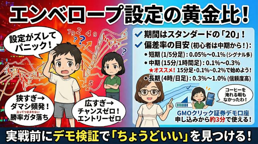 この記事では、エンベロープの正しい使い方、使ってはいけない相場環境、そして根拠を重ねたエントリー手順まで、私の失敗経験を踏まえて全部解説するわね。