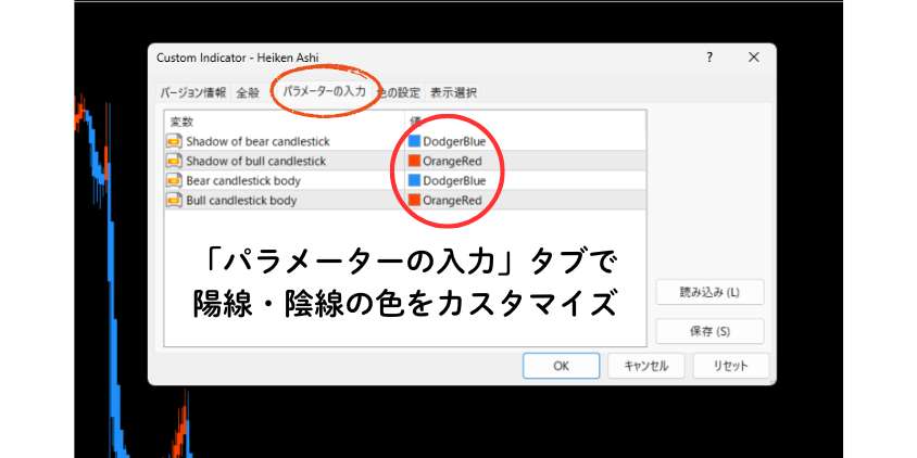 設定画面の「パラメーターの入力」タブで陽線・陰線の色をカスタマイズ