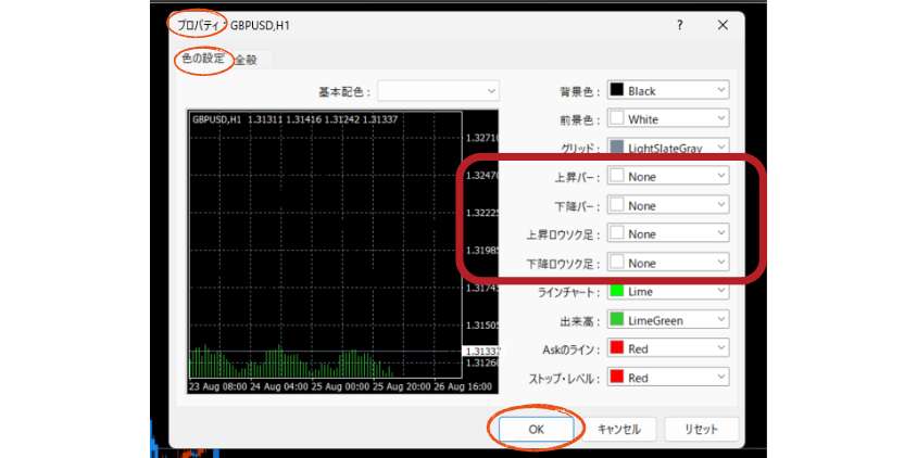 チャート上で右クリック →「プロパティ」→「色の設定」で、上昇バー・下降バー・上昇ローソク・下降ローソクの色を「None」に設定して元のローソク足を非表示にする