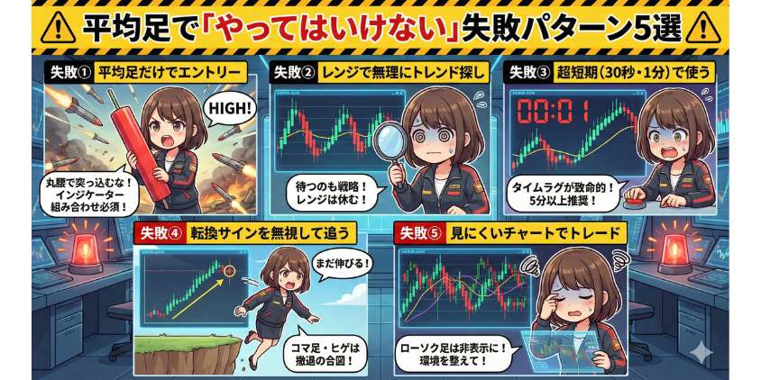 ここまで読んで「よし、やるぞ!」と意気込んでいるかもしれないけど、ちょっと待ってね。平均足でありがちな失敗パターンを先に知っておくことで、無駄な負けを回避できる。私自身がやらかしたものも含めて5つ紹介するわ。