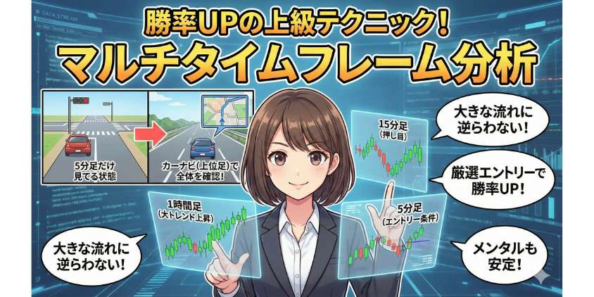 エントリー手法を覚えたら、次はその精度を上げるテクニックだ。マルチタイムフレーム分析を取り入れると、勝率がもう一段階上がるわ。