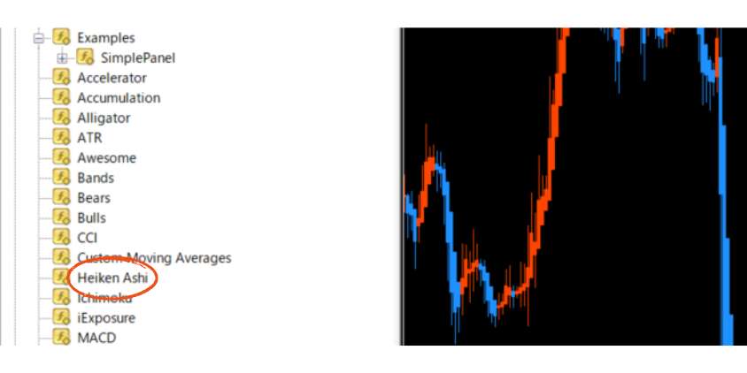 「インディケータ」→「Custom Indicators」(または「Examples」)の中から「Heiken Ashi」を探す
