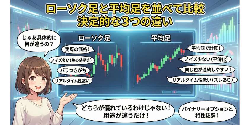 目的によって使い分けるのがベスト。「トレンドの大きな流れを見たい」なら平均足、「細かい値動きやセットアップを確認したい」ならローソク足。理想は両方のチャートを別ウィンドウで表示して併用すること。