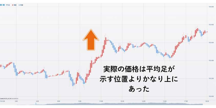 平均足は「平均値」で描かれているから、表示されている価格と実際の現在価格にズレがある。