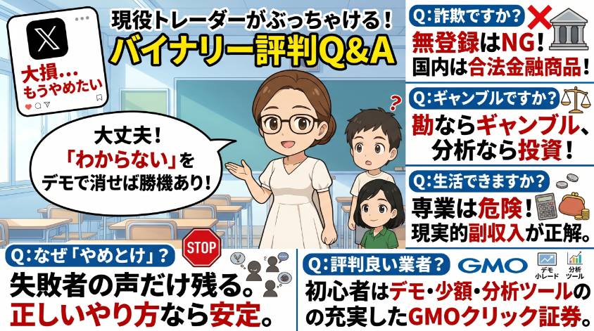 「バイナリーオプション 評判」で調べている人が共通して抱える疑問に、正直に答えるわ。