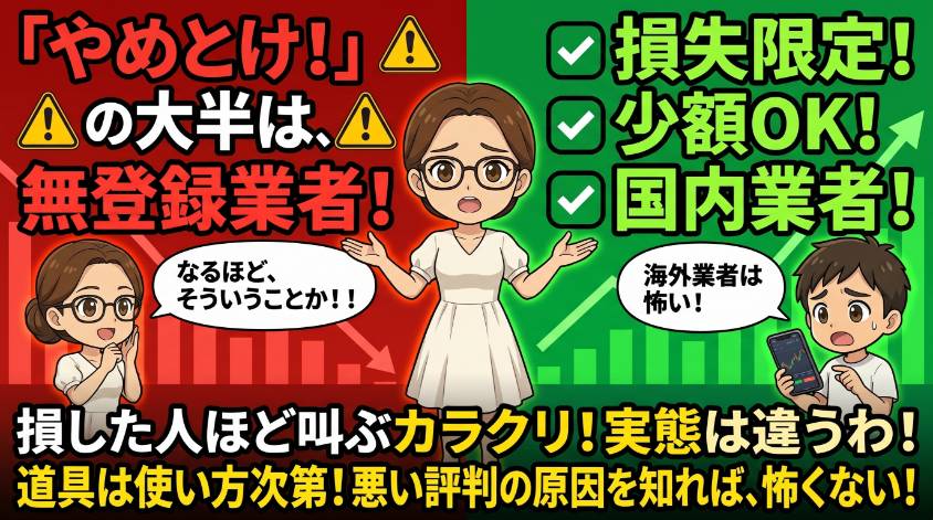 ネットを開けば「詐欺だ」「やめとけ」「大損した」という文字が目に飛び込んでくる。かと思えば「少額で始められる」「損失が限定される」「簡単でわかりやすい」という声もある。どっちが本当なの?怖いの?安全なの?そう思って検索したんでしょ。