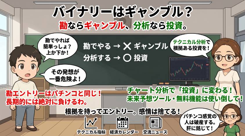 「勘でやればギャンブル、テクニカル分析をすれば投資」、これが正直なところ。上がるか下がるかの予測は、根拠がなければコインの裏表と同じで勝率50%以下になる。でも移動平均線・ボリンジャーバンド・RSIなどのテクニカル指標を使って根拠のあるエントリーをすれば、勝率を50%以上に高めることができる。同じバイナリーでも、やり方で全く別物になるのよ。
