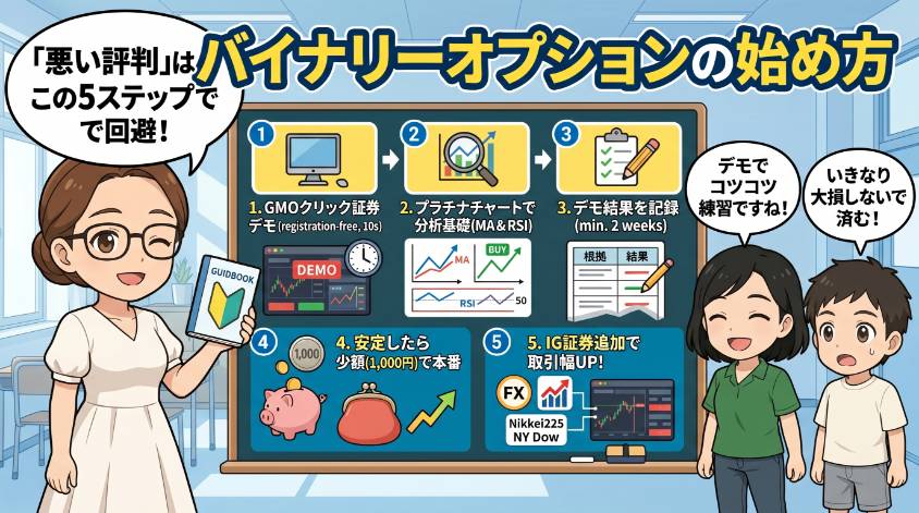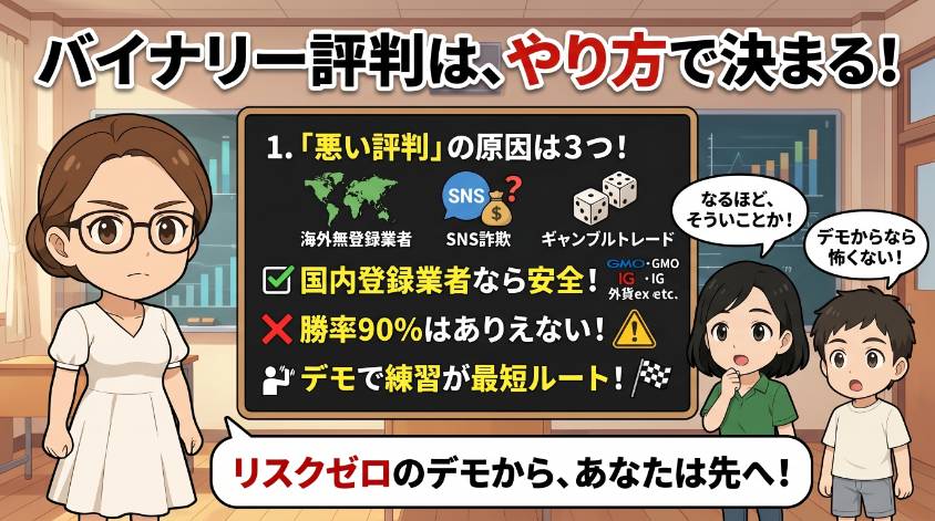 悪い評判を書いている人の多くは、このステップを踏んでいないの。いきなり海外業者で本番→大損→「バイナリーはやめとけ」という評判になる。このパターンを避けるだけで、あなたは「良い評判側」に回れるわ。