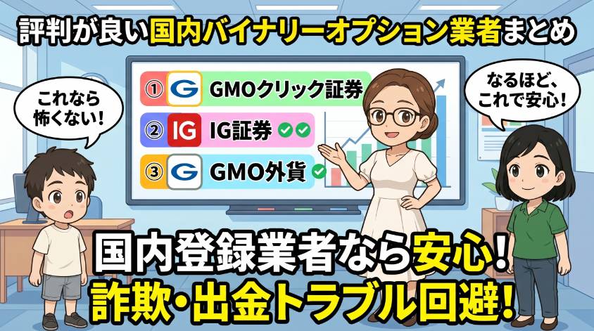 仕組みを説明するわ。日本でバイナリーオプションを提供するには、金融庁への登録が必要。国内の登録業者は信託保全といって、顧客の資産を自社の資産と分けて管理することが義務付けられている。だから万が一業者が倒産しても、あなたの資産は守られるの。
