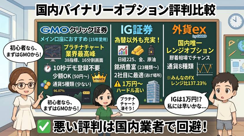 ここまで国内3社の評判を比較してきたわ。結論として、国内の金融庁登録済み業者を使えば、「出金できない」「詐欺だ」という悪い評判の大半は回避できる。評判を比較した結果、初めての人に最もおすすめできる3社をまとめたから、ここでチェックしてみて。