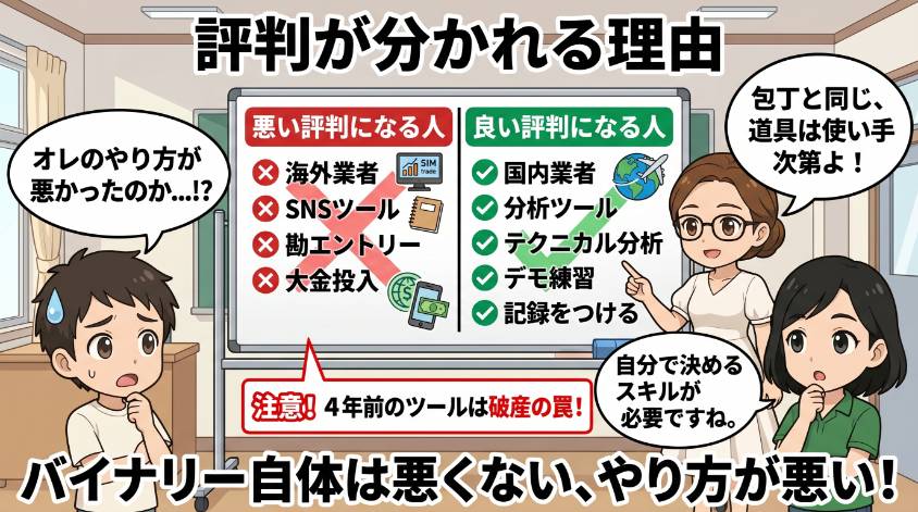 結論を先に言う。評判が両極端に分かれる理由は、バイナリーオプション自体にあるんじゃない。「誰が・どこの業者で・どんなやり方をしたか」の差が、そのまま「良い評判」と「悪い評判」に分かれているだけなの。