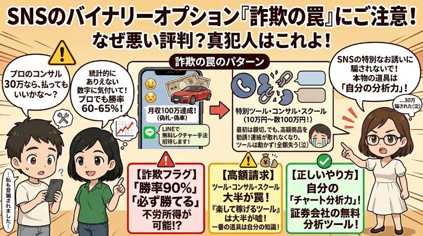 - InstagramやXで「バイナリーで月収100万達成!」「この必勝法があれば誰でも稼げる」と投稿