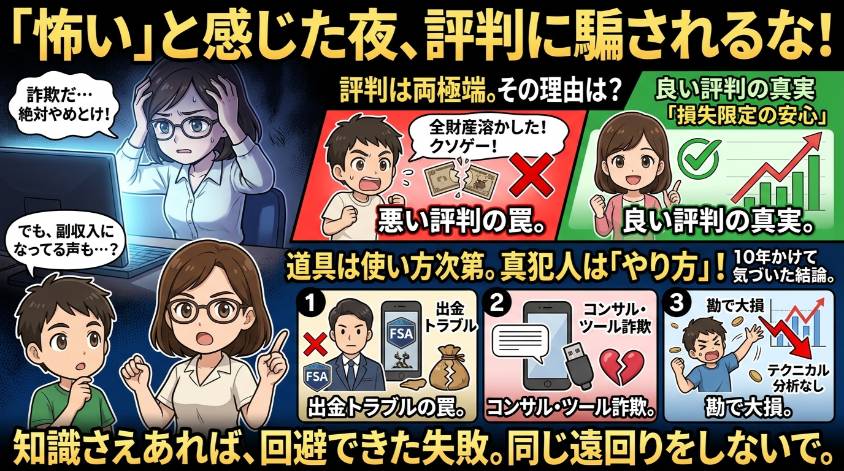 間違ったやり方をした人の体験談がSNSや口コミサイトに多く残っているから、というのが最大の理由よ。人は損した時の方が書き込む。正しくやって毎月少額ずつ副収入を得ている人は、わざわざ「今月も順調です」と書き込まない。だから評判が「やめとけ」に偏って見える。でもその「やめとけ」の人のやり方を見ると、海外業者・詐欺ツール・勘エントリーのどれかに当てはまることがほとんどよ。