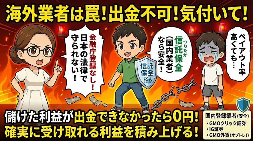 正直に白状すると、私も一度だけ「海外業者はペイアウト率が高い」という評判に釣られそうになったことがあるの。ペイアウト率85%の業者を見つけて、「GMOより稼げるかも」と調べ始めた。でも調べていくうちに、その業者が金融庁の警告リストに載っていることに気づいたの。出金できなければ、ペイアウト率が100%でも意味がない。国内業者を使うだけで、「詐欺」「出金できない」という悪い評判の半分は回避できるのよ。
