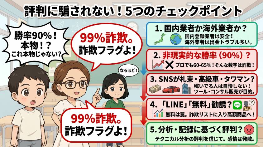- 「勝率90%」「必ず稼げる」という評判は詐欺フラグ。統計的にありえない数字