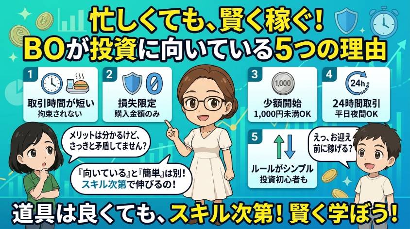 - 取引時間が短い・損失限定・少額OKなど、忙しい人に向いている面はある