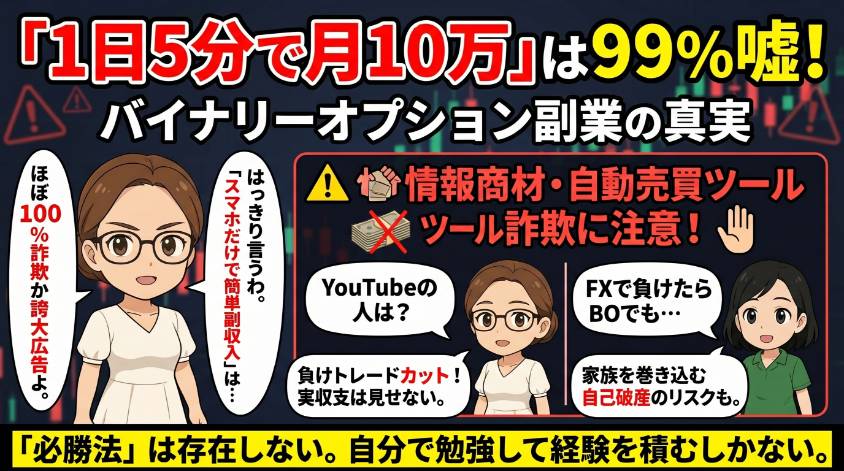 - 「バイナリーオプションで副業!1日5分で月10万」は99%嘘