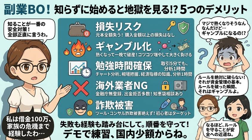 ただし、ここで安心して油断しちゃダメ。「副業じゃない=気軽にできる」じゃないから。投資は投資。それなりの知識と覚悟が必要よ。