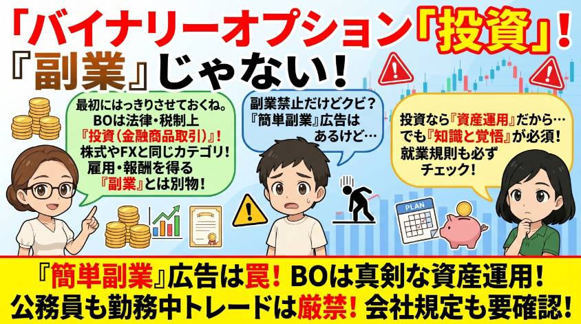 ちょっと考えてみて。株をやってる人が「副業してます」とは言わないでしょ? それと同じ。バイナリーオプションも「資産運用」であって「副業」ではない。