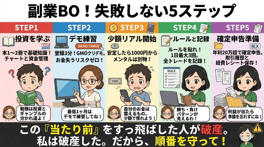 この5ステップ、「当たり前じゃん」って思うかもしれない。でもね、この「当たり前」をすっ飛ばして、いきなりリアルマネーで始めた人が破産してるの。私がそうだった。だから、面倒でもこの順番を守って。