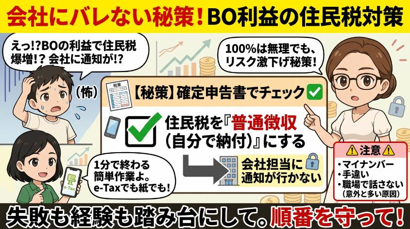 私は専業主婦だから会社バレの心配はないんだけど、サラリーマン時代の夫は住民税を普通徴収にして、投資の利益を自分で申告してたわ。実際にやってみると難しくないから、安心して。