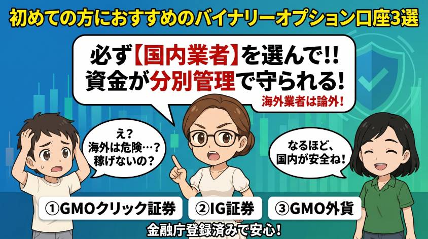 バイナリーオプションを始めるなら、必ず金融庁に登録された国内業者を選んで。海外業者は論外。国内業者なら資金の分別管理が義務化されていて、業者が倒産しても顧客の資産は守られる。