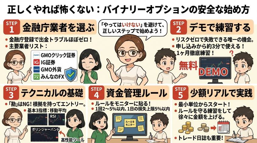 - 正しくやるには:国内業者 → デモトレード → テクニカル分析 → 資金管理 → 少額リアル