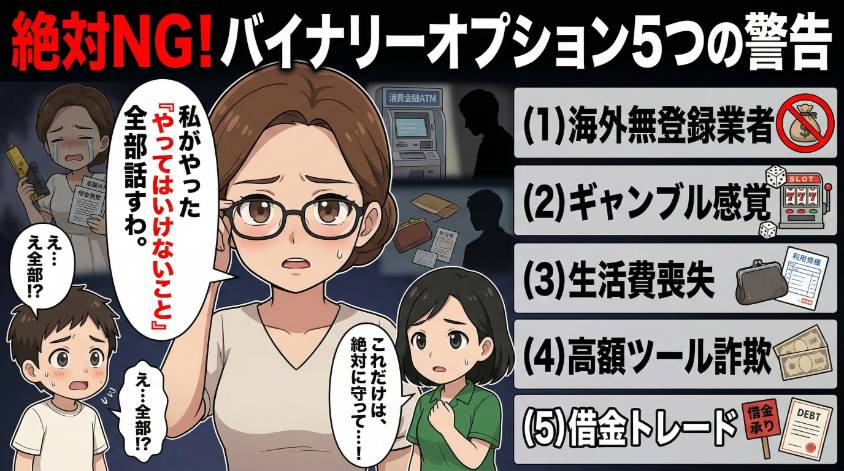この記事では、バイナリーオプションで絶対にやってはいけないこと5つと、正しい始め方を、私の痛い失敗談を交えて全部話すわ。Xや知恵袋には「バイナリーオプション詐欺に引っかかって死にたい」という切実な声もあるの。あなたが同じ目に遭わないように、この記事が防波堤になれたら嬉しいわ。