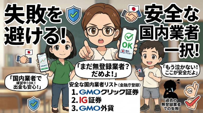 これが最も深刻で、最も被害が多い「やってはいけないこと」。金融庁に登録されていない海外業者は、日本の法律の保護が及ばないの。つまり何かトラブルが起きても、あなたを守ってくれる法律がないということ。