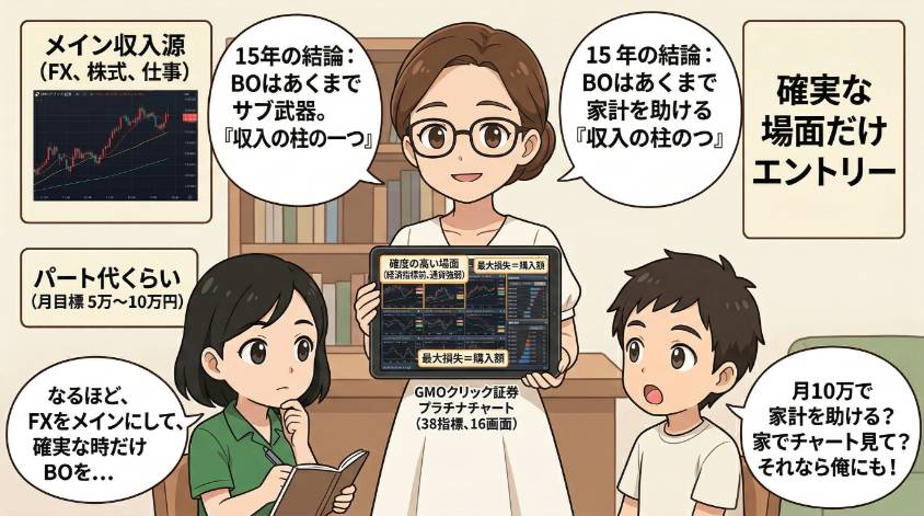 私はFX歴15年の中で、BOを「確度の高い場面だけ使うサブ武器」として使ってきた。派手な月収報告なんてできないけど、毎月コツコツとパート代くらいの利益を出してるわ。子供の習い事代、家族のちょっとした外食代。BOのおかげで、ちょっとだけ生活が豊かになった。