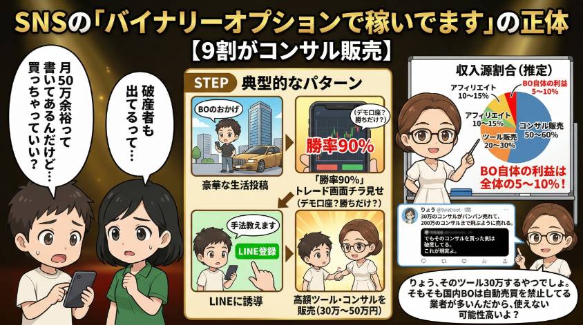 - SNSの「バイナリーオプションで稼いでます」の正体【9割がコンサル販売】