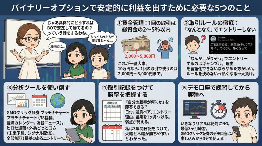 - バイナリーオプションで安定的に利益を出すために必要な5つのこと