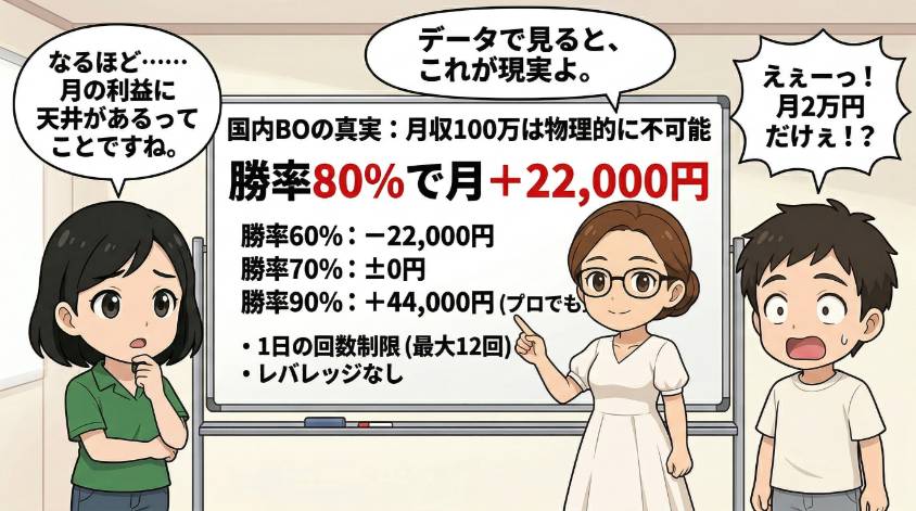 勝率90%を毎月維持するなんて、プロでも至難の業よ。つまり、国内BOの構造上、月に数万円が現実的な上限。月収100万なんて物理的に不可能なの。