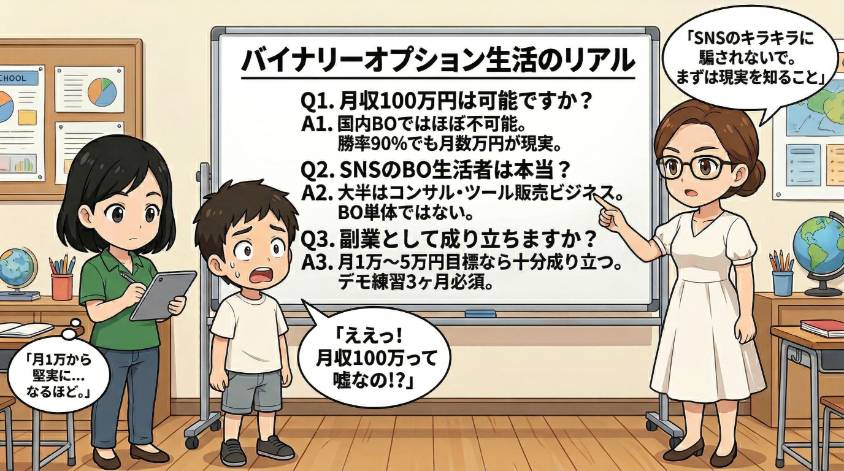 国内バイナリーオプションの構造上、ほぼ不可能。1日の取引回数は最大12回、ペイアウトは固定1,000円なので、月間収益に上限がある。勝率90%を維持しても月に数万円が現実的な上限よ。SNSで「月収100万」と言っている人の大半は、BO自体ではなくコンサル販売やツール販売で稼いでいるわ。