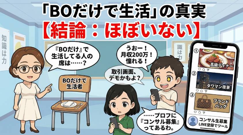 SNSで「BOで生活してます」と言っている人の大半は、BOの収益ではなく「BOを教えます」ビジネス(コンサル販売・ツール販売・アフィリエイト)で稼いでいるの。プロフィールに「コンサル生募集中」「LINE登録で無料ツール」と書いてあったら、その人の主な収入源はBO以外よ。