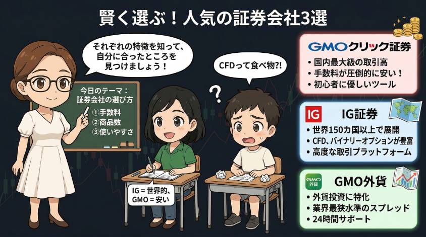 BOで安定して勝つには、分析ツールが充実していて信頼できる国内業者を選ぶことが大前提。私が実際に使っている中で、初めての方にもおすすめできる口座を3つ紹介するわ。