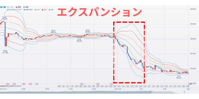 ボリンジャーバンドが大きく拡大(エクスパンション)している時は逆張り厳禁。